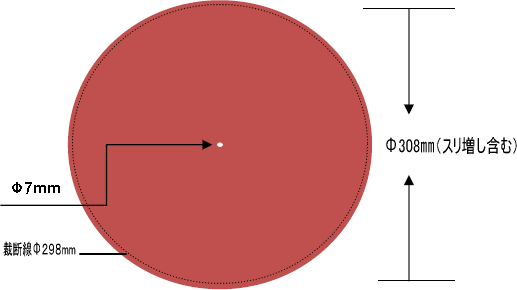 下図の範囲(Φ308mm)内にデザインしてください。実際寸法に抜き加工します。